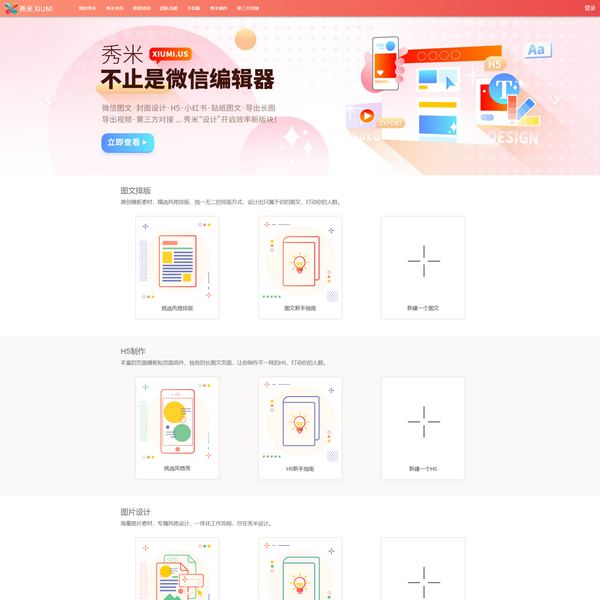 秀米,微信公眾號圖文排版和H5制作工具,海量模板素材和排版樣式,強大的布局編輯功能,輕松制作公眾號圖文和H5,打動你的人群!