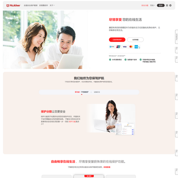 McAfee 是在線保護領(lǐng)域的領(lǐng)導(dǎo)企業(yè)。屢獲殊榮的防病毒軟件為您提供全方位的隱私和身份保護,讓您暢享在線生活。