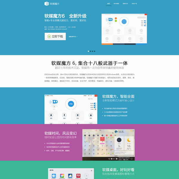 軟媒魔方,Windows系統(tǒng)增強(qiáng)輔助工具,智能+專業(yè)雙操控模式,系統(tǒng)故障一鍵式解決方案,真正實(shí)現(xiàn)一鍵優(yōu)化、一鍵清理、一鍵軟件升級。軟媒時(shí)間,日程提醒、農(nóng)歷天氣,so easy!軟媒時(shí)間,系統(tǒng)美化輕松搞定,桌面好炫酷!簡單、好用、好玩,裝機(jī)必備,從軟媒魔方開始。更有網(wǎng)速限速、U盤啟動(dòng)、DNS助手、壁紙美化等功能等你發(fā)現(xiàn)。