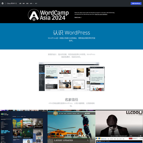 WordPress是一款能讓您建立出色網(wǎng)站、博客或應用程序的開源軟件。美觀的設計,強大的功能,助您自由發(fā)揮心中所想。WordPress既是免費的,也是無價的。43% 的網(wǎng)站都在使用WordPress,小到興趣博客,大到新聞網(wǎng)站。您可充分利用超過55,000個插件擴展WordPress,以讓您的網(wǎng)站滿足需求。您可以增加網(wǎng)店、相冊、郵件列表、論壇、統(tǒng)計分析等更多功能。