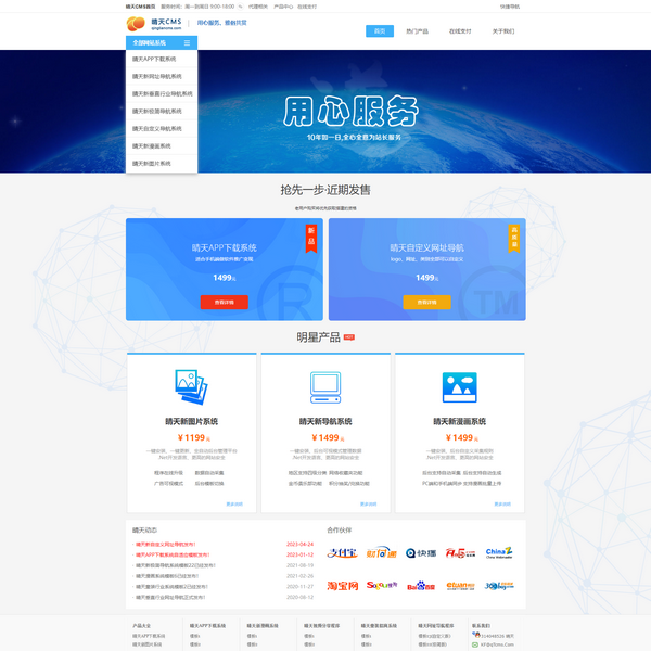 旗下?lián)碛星缣祀娪跋到y(tǒng)、晴天漫畫程序、晴天動(dòng)漫視頻程序、晴天圖片程序、晴天網(wǎng)址導(dǎo)航程序、晴天電視劇分享程序、晴天童裝行業(yè)系統(tǒng)、晴天女裝行業(yè)系統(tǒng)、晴天APP下載系統(tǒng)等一系列為站長(zhǎng)服務(wù)的CMS。