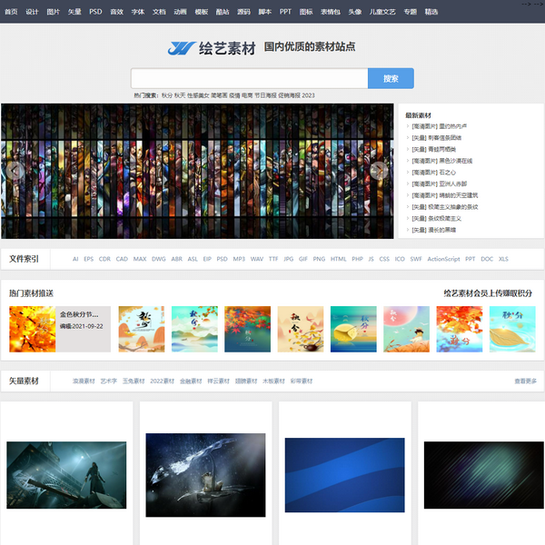 繪藝素材網(wǎng)是一家大型綜合設計類素材網(wǎng)站,提供矢量素材、圖標素材、高清圖片素材、psd素材、字體下載、音效素材、flash動畫素材、網(wǎng)頁模版素材、ppt模版素材、設計源碼等設計素材,免費安全快速下載。