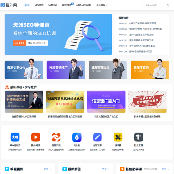 搜外網(wǎng)專注SEO培訓(xùn)以及網(wǎng)絡(luò)營(yíng)銷技術(shù)視頻網(wǎng)課。為廣大站長(zhǎng)提供SEO系統(tǒng)技術(shù)知識(shí)學(xué)習(xí),掌握搜索引擎排名流量的獲取技術(shù)。新增Google獨(dú)立站SEO,另提供符合SEO優(yōu)化的6系統(tǒng)、友鏈交換的搜外友鏈。