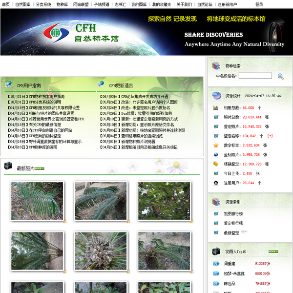 中國自然標本館(Chinese Field Herbarium,簡稱CFH)是中國科學院植物研究所建設的生物多樣性信息網絡平臺,致力于為用戶生物多樣性數據的采集、管理、利用提供全套解決方案,并將廣泛的志愿者力量綜合起來,推動大范圍的生物多樣性本底調查工作。CFH的原則是公平、公開、志愿、合作、互動,用戶的數據提交與平臺的服務提供不以任何經濟利益為目的,但歡迎相關的研究合作與經費支持。