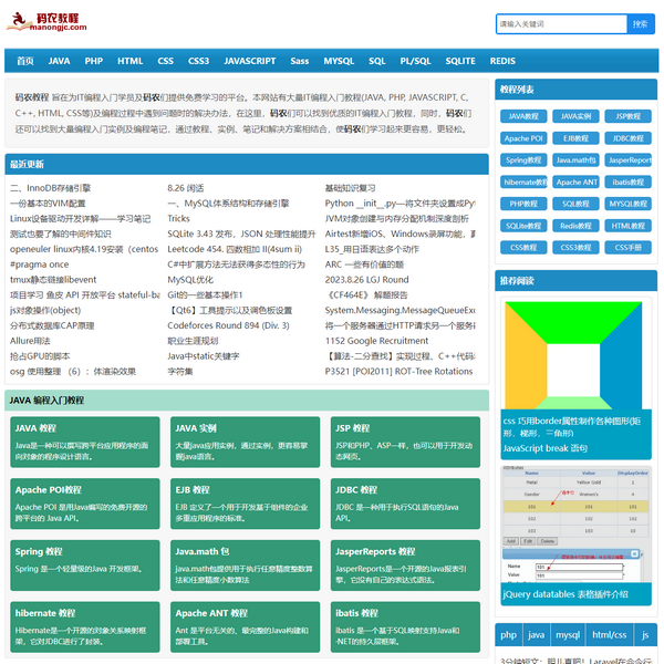 碼農(nóng)教程旨在為碼農(nóng)們提供免費的IT編程入門教程和編程學(xué)習(xí)平臺,本碼農(nóng)網(wǎng)涵蓋php、java、mysql、html、css、javascript、jquery等流行的編程入門教程。