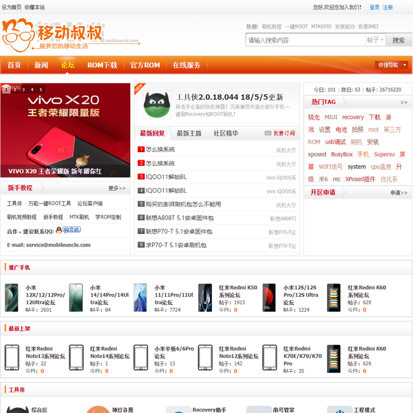 移動叔叔手機(jī)論壇誠意為您提供高通驍龍聯(lián)發(fā)科MTK展訊手機(jī)的一鍵ROOT,手機(jī)刷機(jī)教程,中文TWRP Recovery,官方原廠ROM固件升級下載更新,救磚線刷包下載,曬機(jī)評測,IMEI恢復(fù),軟件游戲APP下載,購機(jī)咨詢,新機(jī)消息等內(nèi)容,給你全方位的售前和售后服務(wù)。