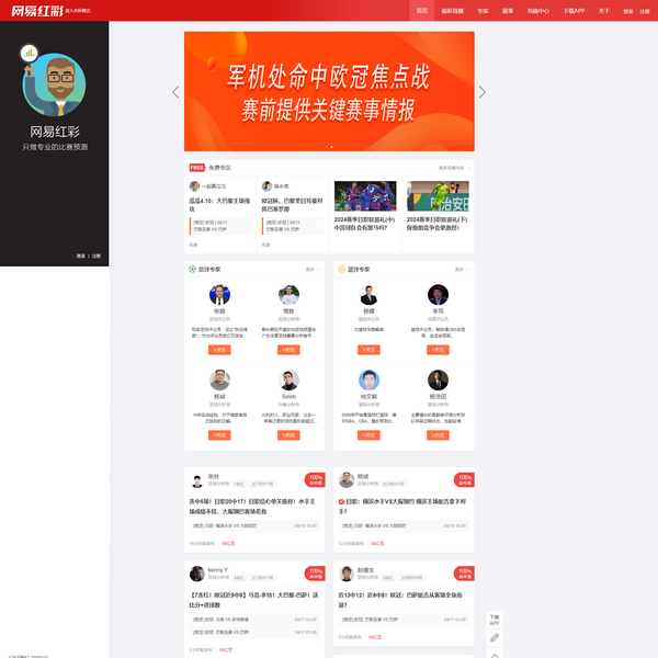 網(wǎng)易紅彩,讓你的競彩一觸即發(fā)!足彩籃彩競彩專家比分預(yù)測彩票平臺。網(wǎng)易紅彩旨在為用戶提供更精準的足球、...