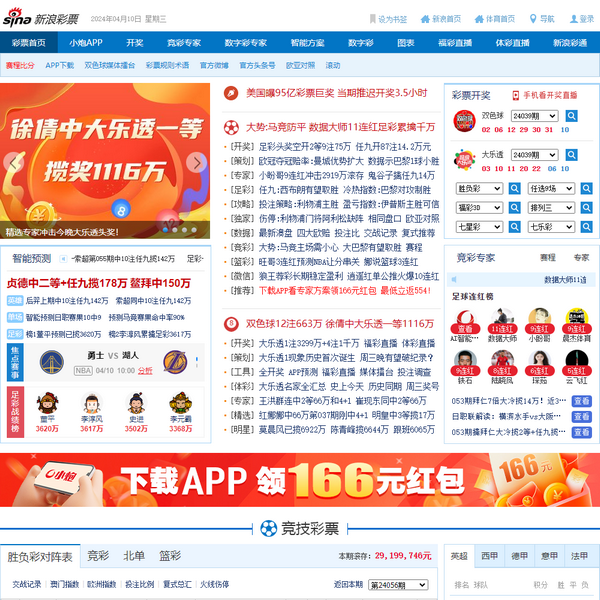 新浪彩票是國內(nèi)最專業(yè)且最值得信賴的彩票平臺,全面覆蓋包括體彩、福彩在內(nèi)的全部彩票內(nèi)容,雙色球、大樂透...