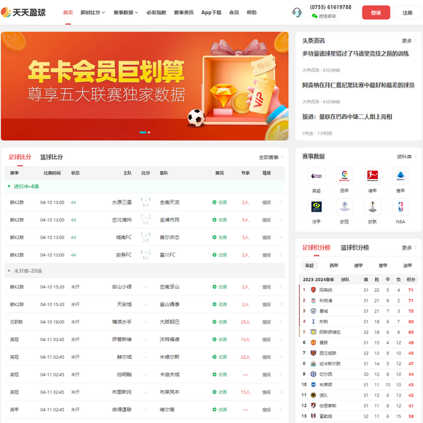 足球比分視頻和動畫賽況,天天盈球提供全網(wǎng)最快最準最全的足球比分,還有免費視頻動畫賽況。包括英超、意甲...