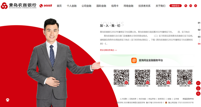 青島農(nóng)商銀行山東省青島市嶗山區(qū)秦嶺路6號魯ICP備12006486號-1青島農(nóng)商銀行https://www.qrcb.com.cn/山東青島